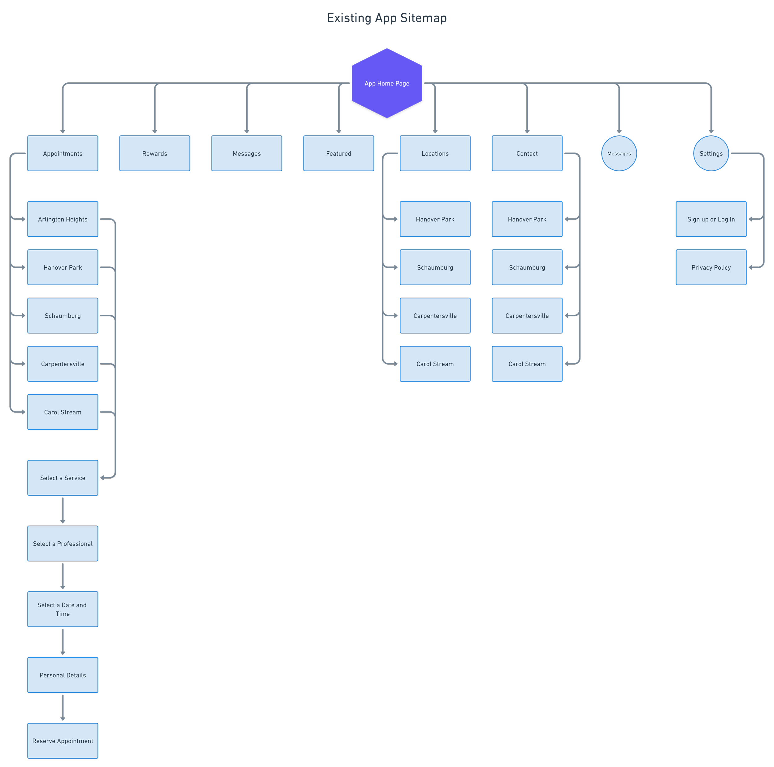 Before even thinking about how I wanted to design the new app, I needed to familiarize myself with the current app. This would allow me to understand the flow that current users need to take to book a new appointment.