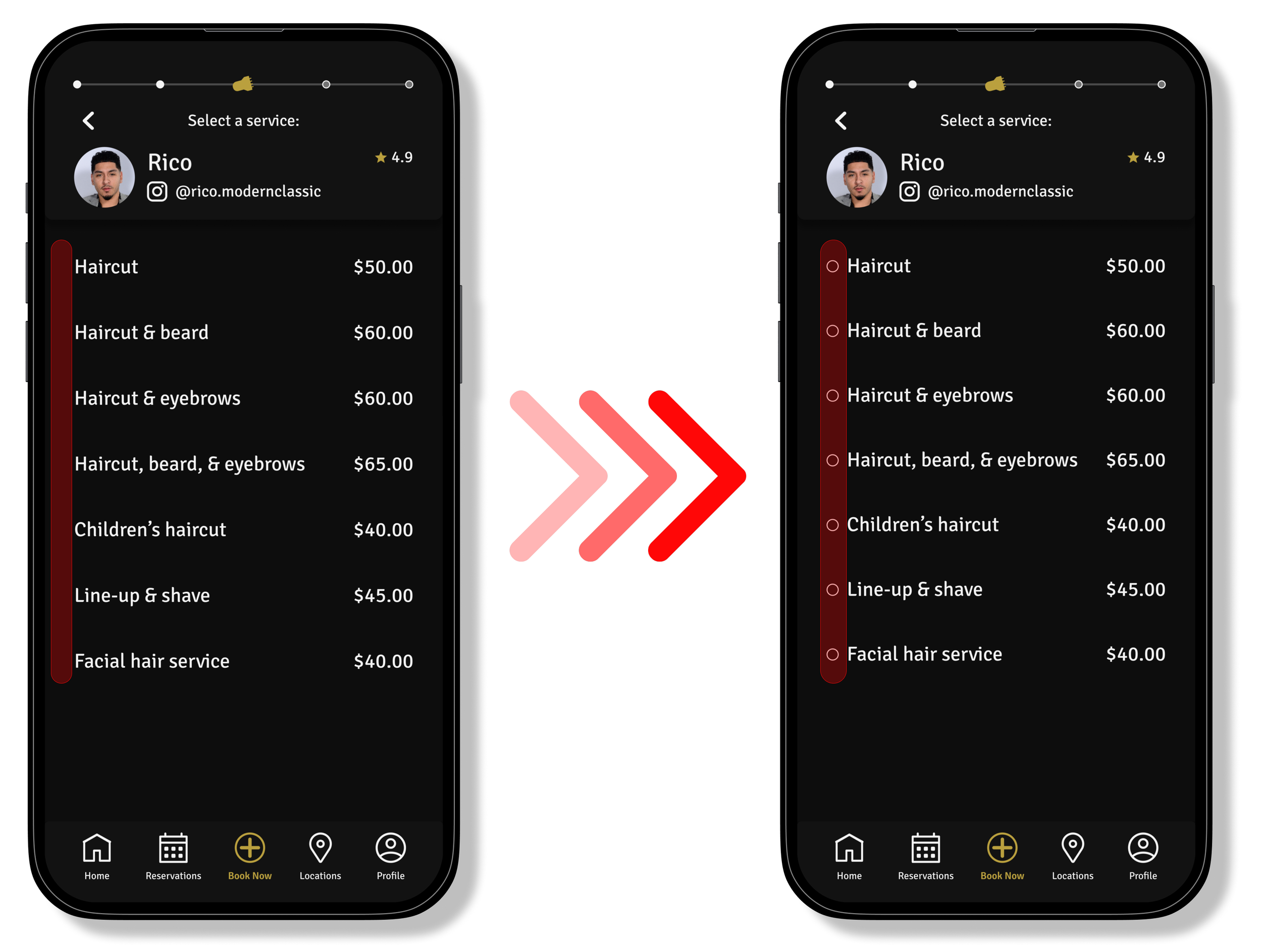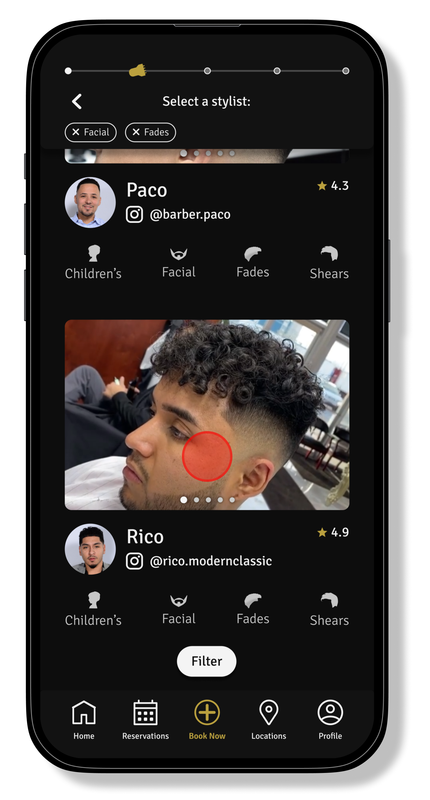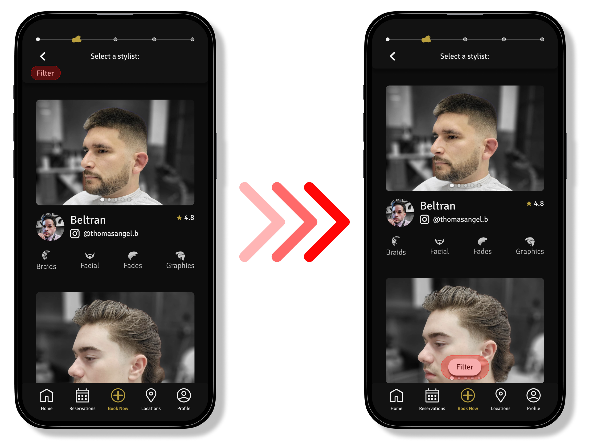 The barber cards have received a full redesign. They now highlight featured photos that the barber chooses to showcase. Their specialties have also been complimented with icons to assist in relaying the information. The barber’s Instagrams are now immediately on display.