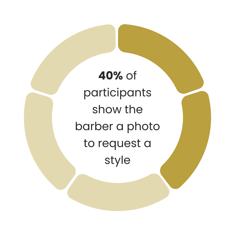 I wanted to understand how users requested what style of haircut to get. Since most interview participants did not know every hairstyle term, there had to be another method of requesting. I discovered that 40% of interview participants request what to get by showing the barber a photo. I will add an easy way for users to do this in the app.