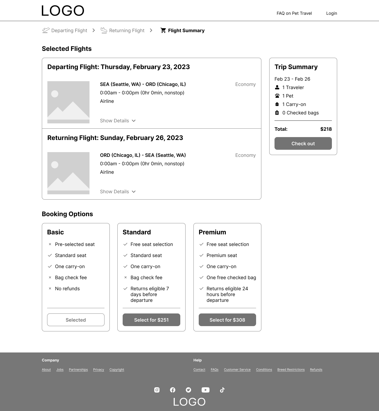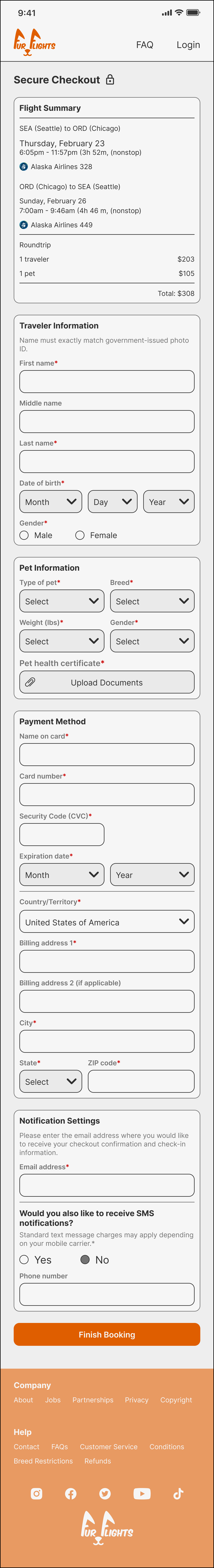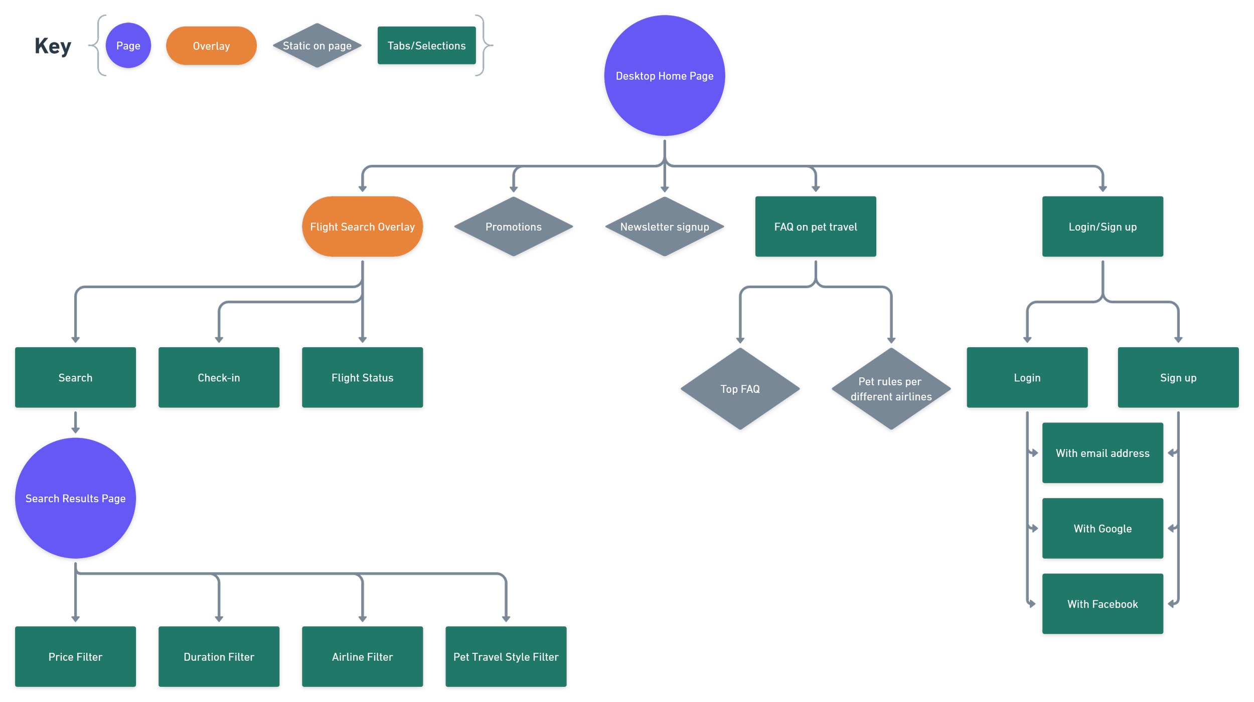 There may be users who frequent Fur Flights’ website as well as first-time visitors. Their paths while navigating the site may be different, and I wanted to take into account all user types. Developing a user flow would assist me when making design decisions. This allowed me to understand the different paths that users may encounter while using the service.