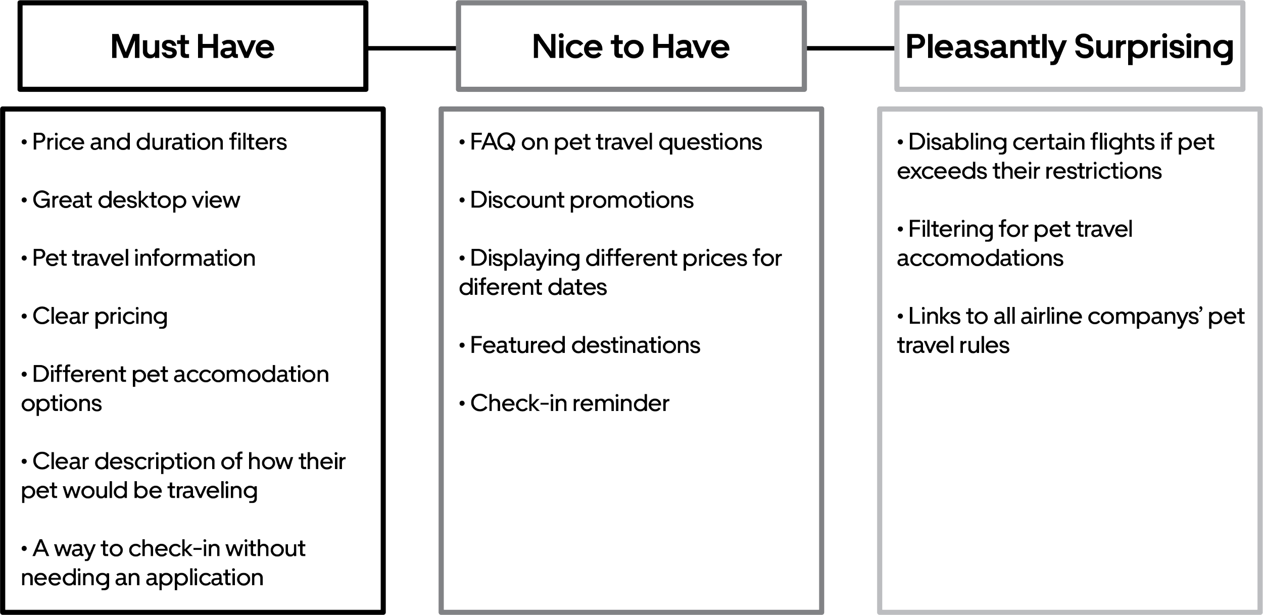 It was now time to develop a list of features for Fur Flights. Although some of these features came directly from Fur Flights, the majority of the features are from accumulating all of my research data thus far.