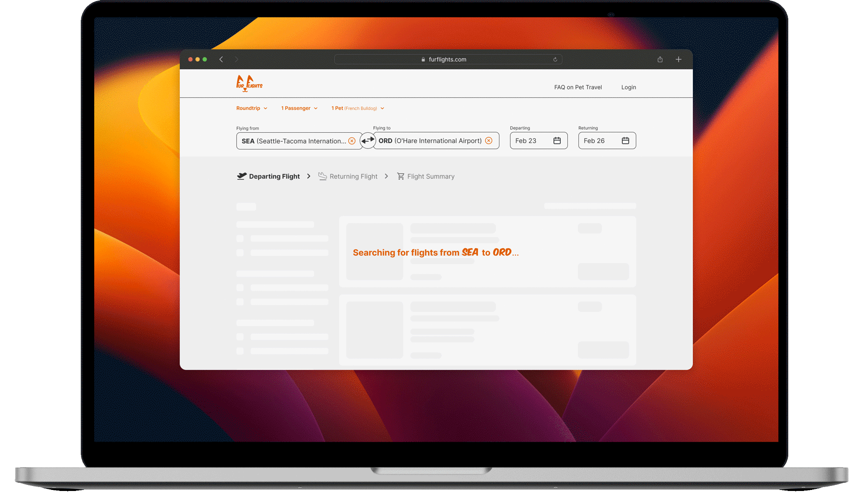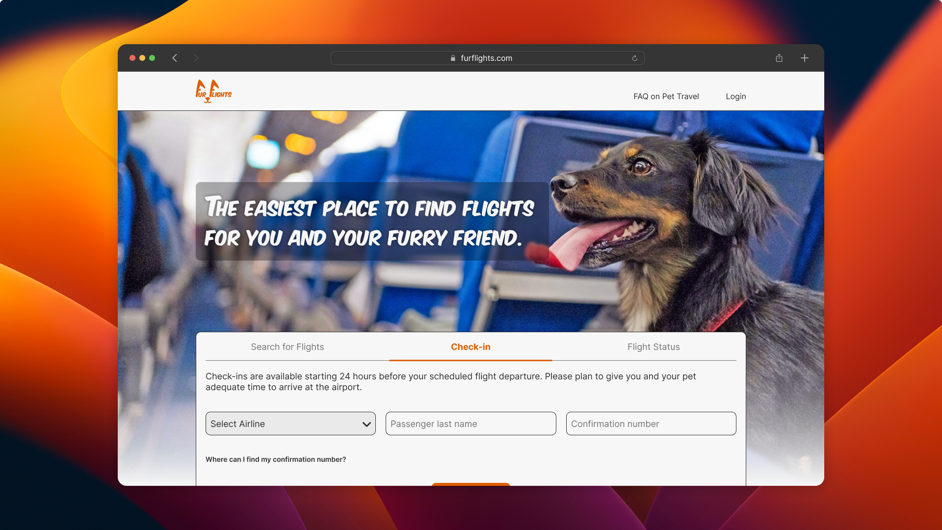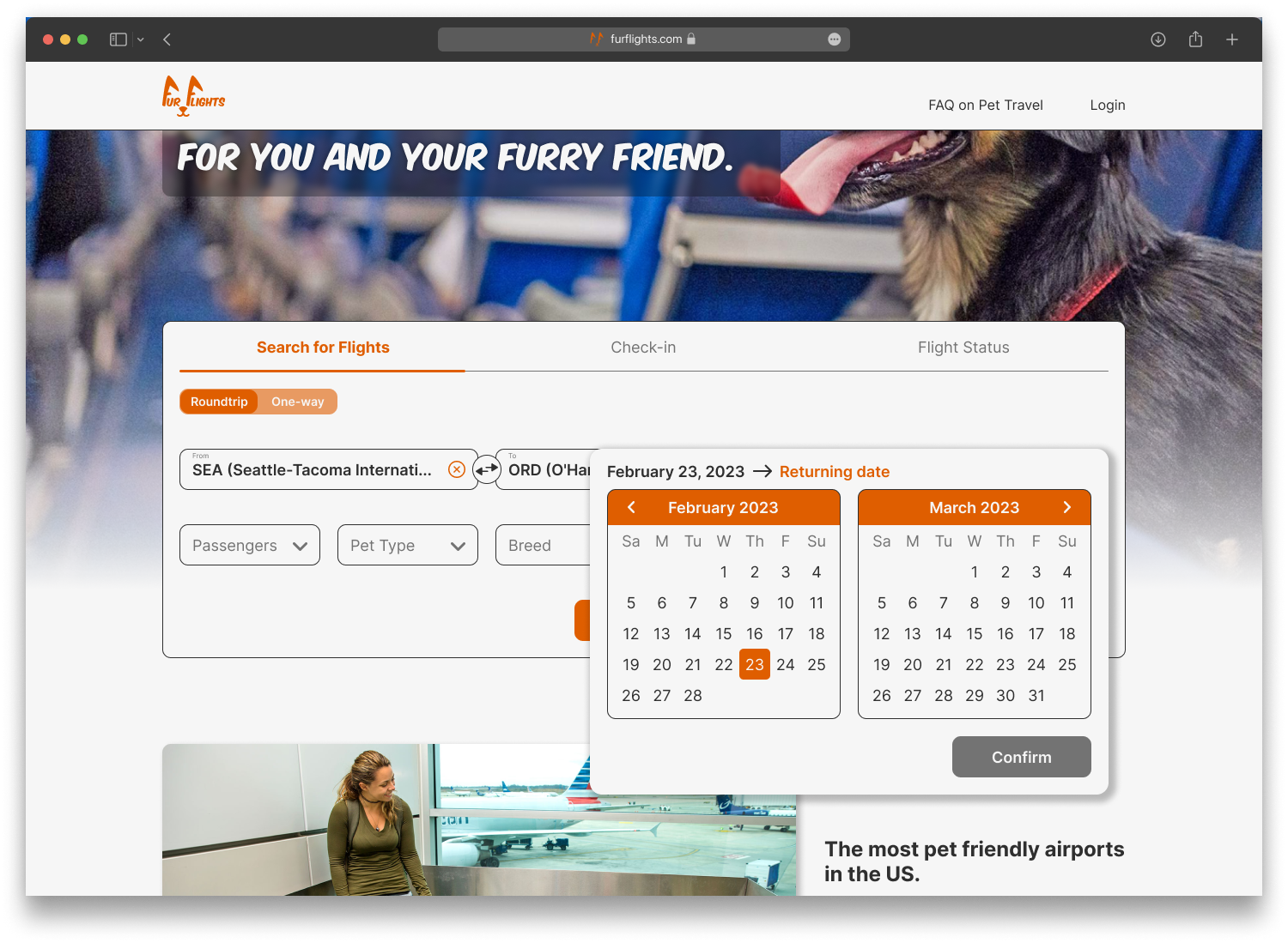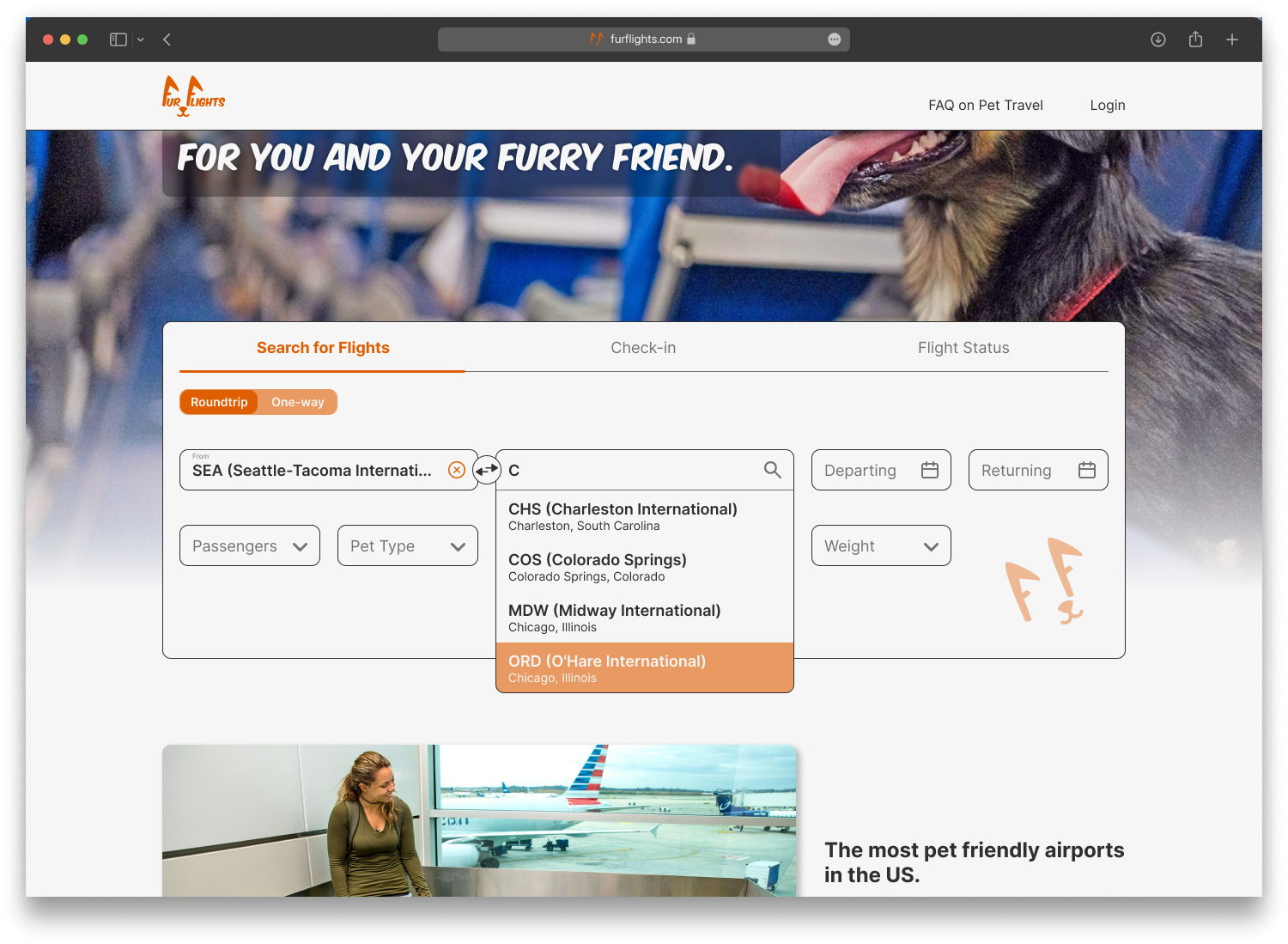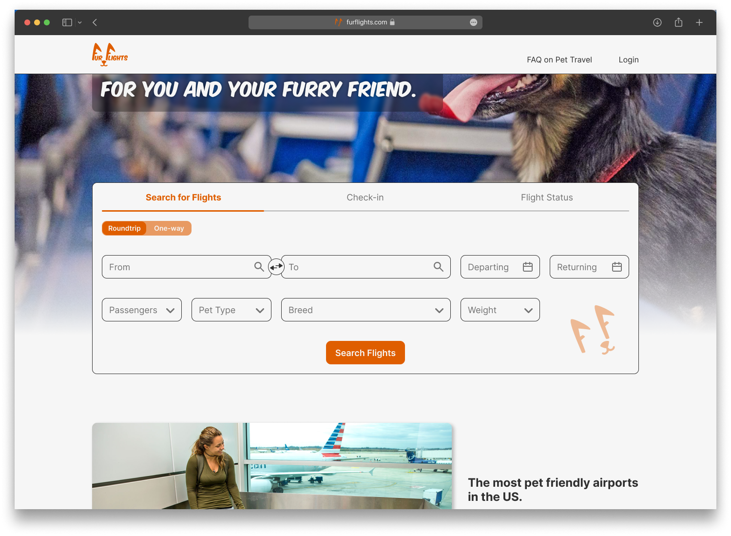 Fur flights is a concept for a booking platform specializing in pet travel.