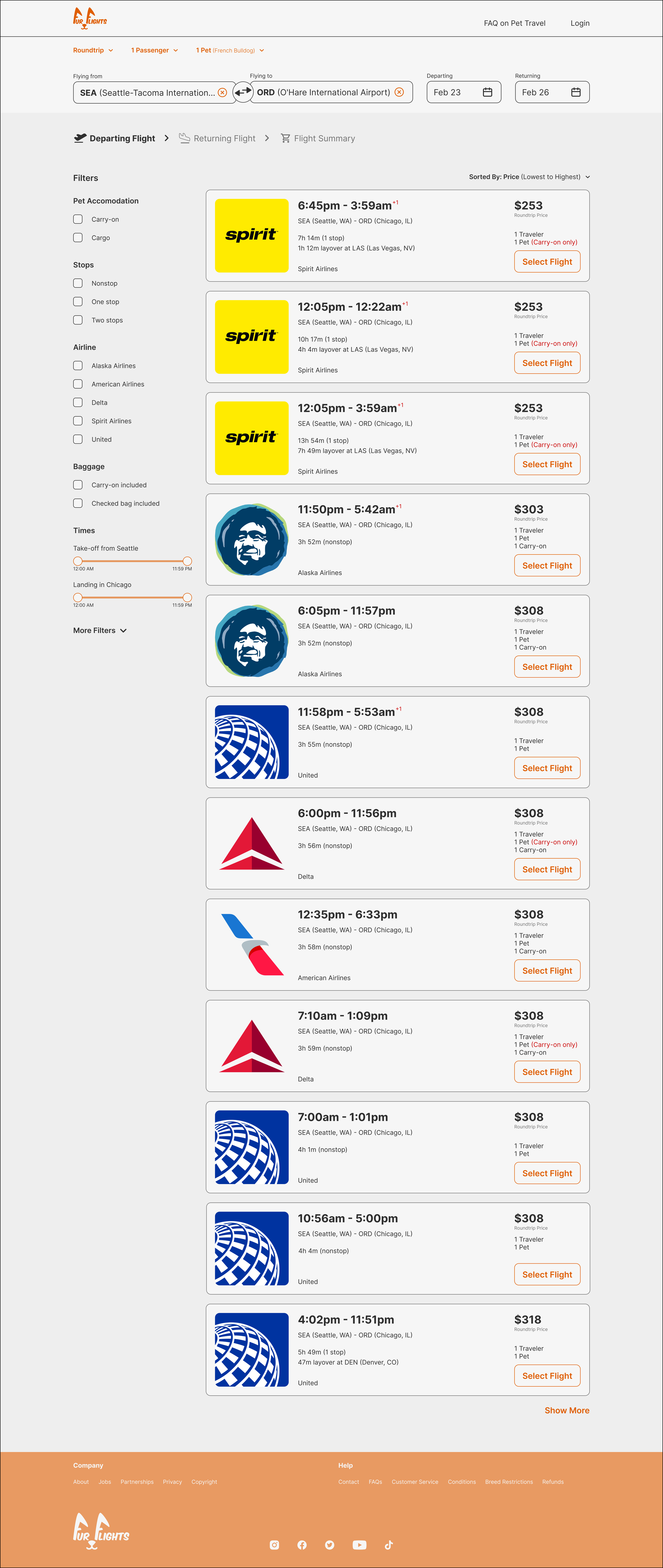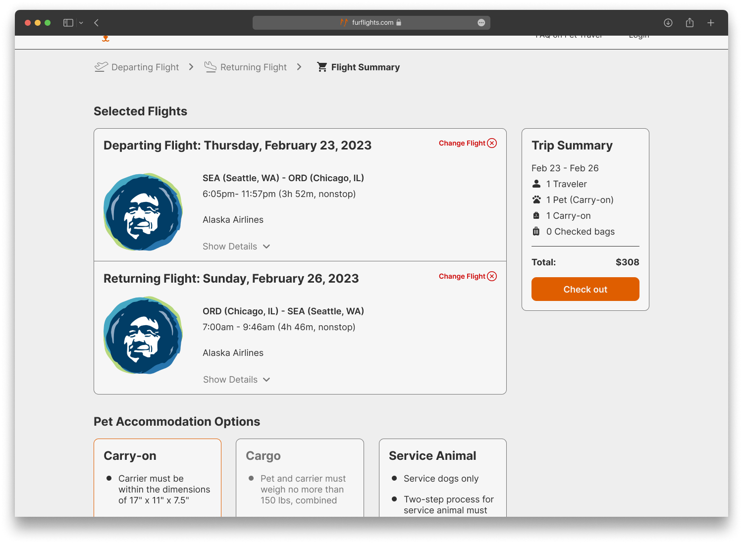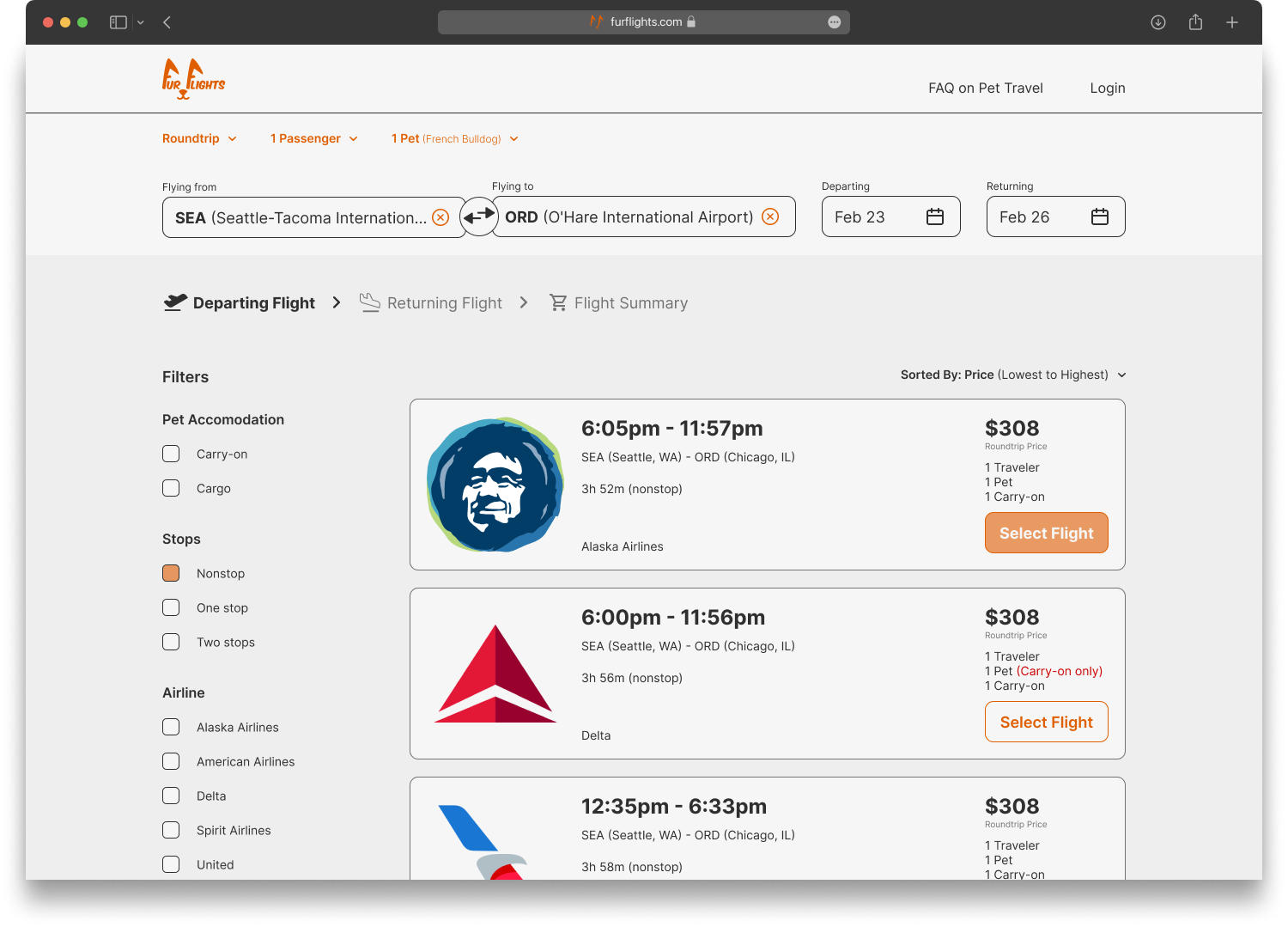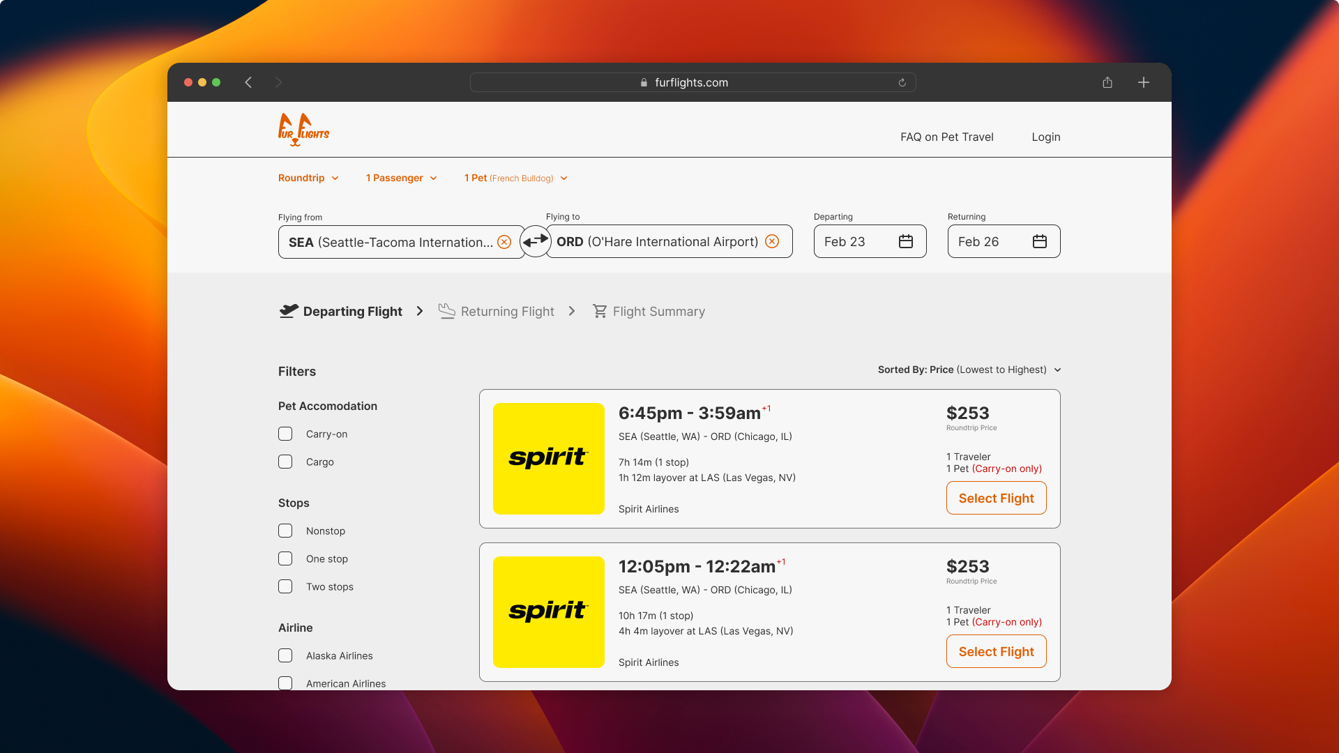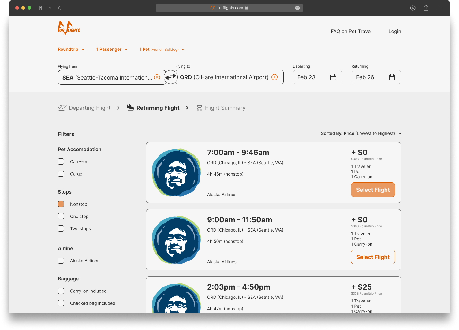 Fur flights is a concept for a booking platform specializing in pet travel.