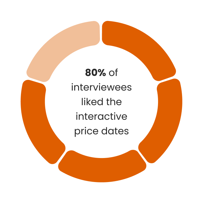 When I posed the question of what features users liked from other sites, almost all of them responded with interactive calendars. This feature shows users the lowers price for each date on the calendar. This is a feature that I would like to add after the MVP.