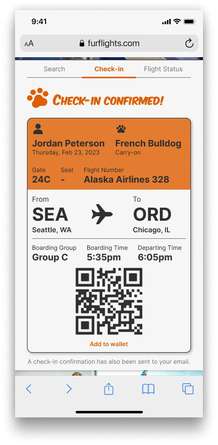 The second part of my prototype was for the check-in process. I created this prototype for mobile view since users frequently add their boarding passes to their mobile wallets for easy access.