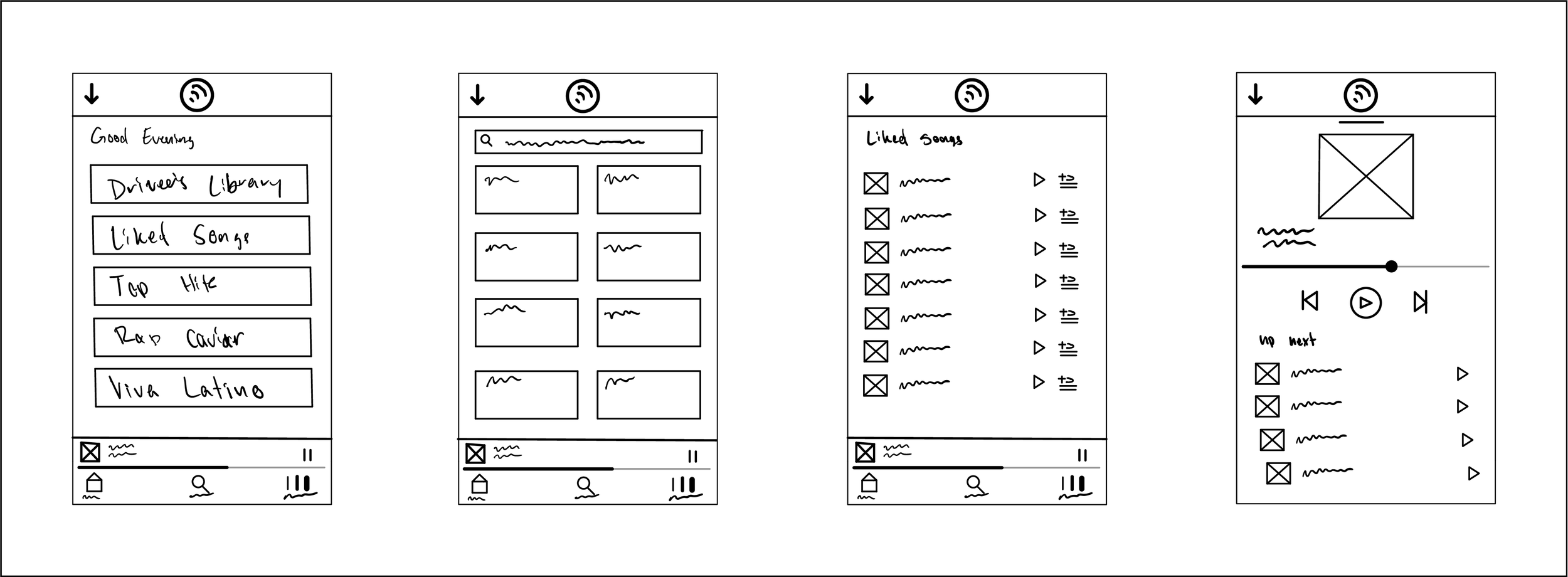 I started my journey by producing low-fidelity sketches on an iPad. These sketches consist of key screens as well as secondary screens based on Uber and Spotify’s current user interfaces. A majority of these screens helped create the final product.