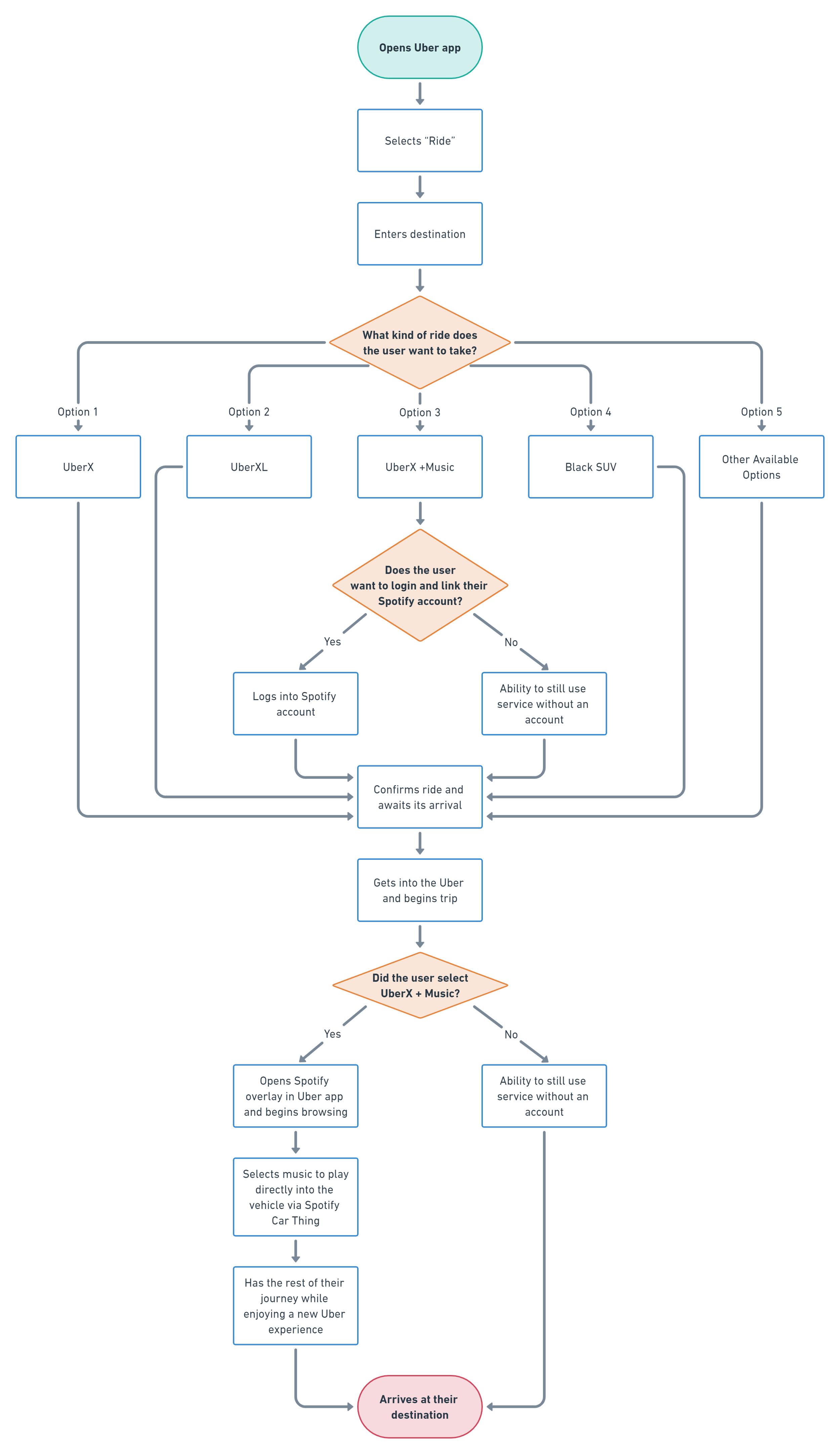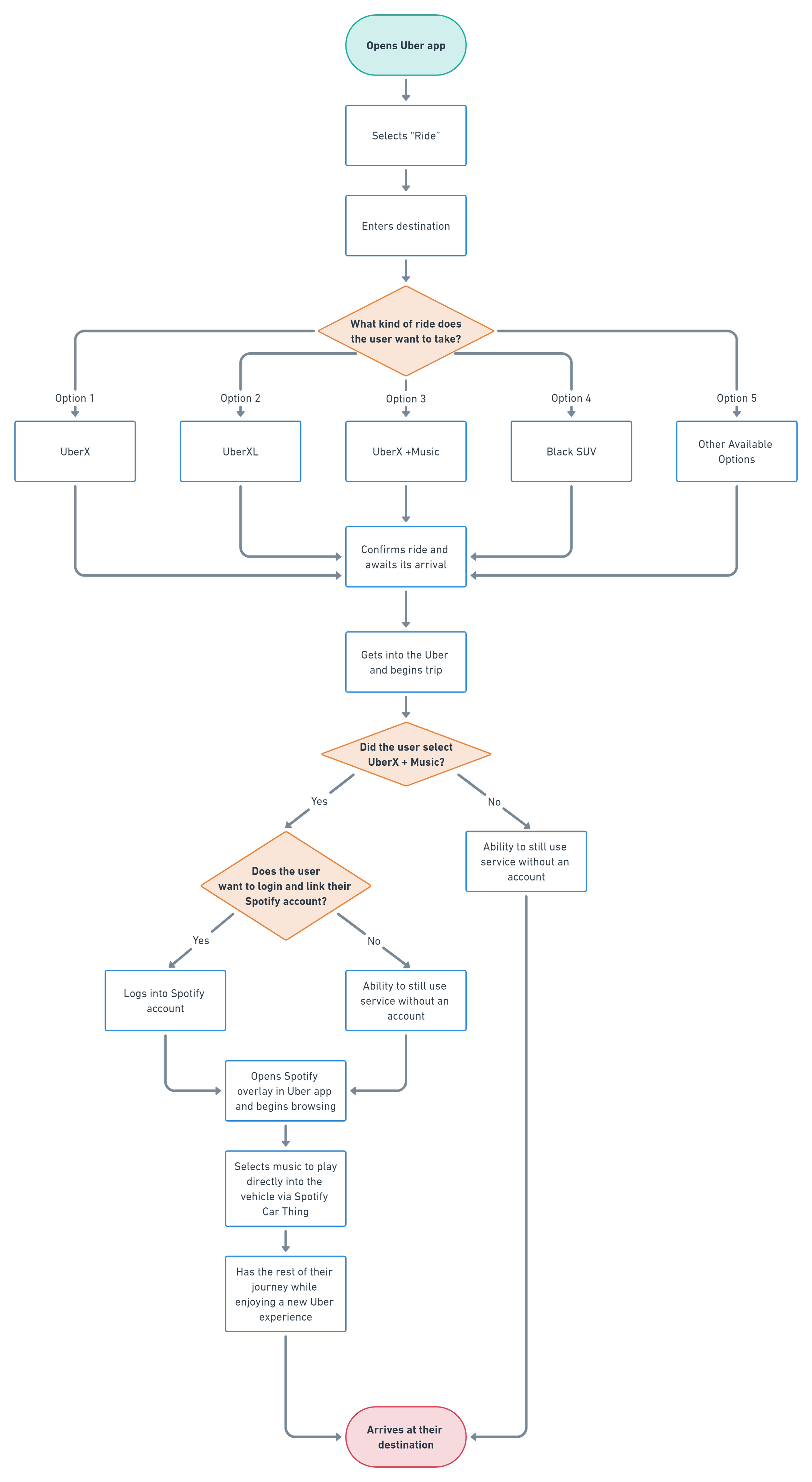 With all of the information I have gathered thus far, it was time to develop an ideal user flow. The goal behind this flow chart was to understand where and how I can integrate Spotify into Uber’s current platform. I needed to be sure not to interrupt the current user journey, but also be able to mesh Spotify into their service.