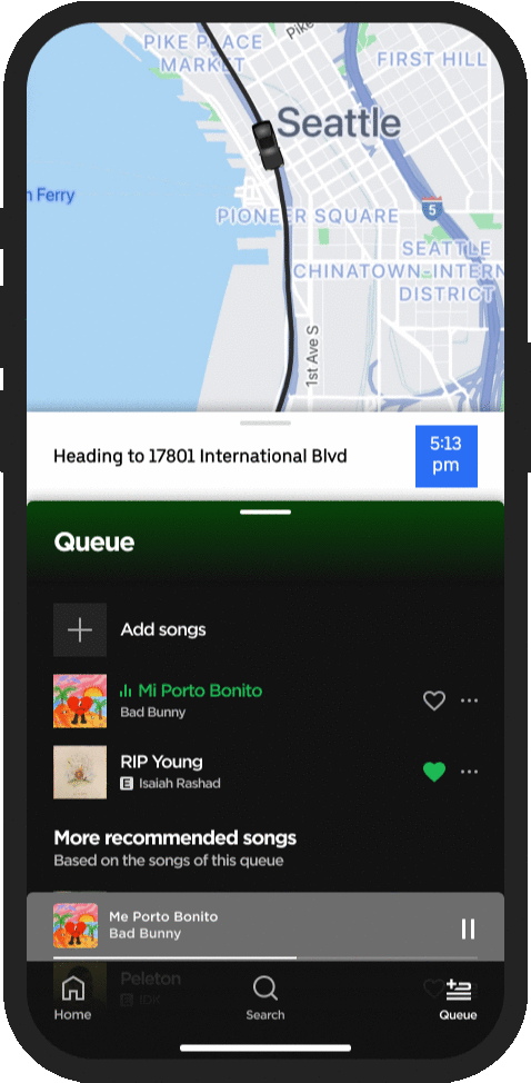 During my usability testing, I discovered that another iteration needed to be made. This discovery was based on users who were familiar with Spotify and their swipe shortcuts. 3 out of the 5 participants tried to swipe to queue the song. This is Spotify’s way of streamlining its user interface, so I added that feature to the final design as well.