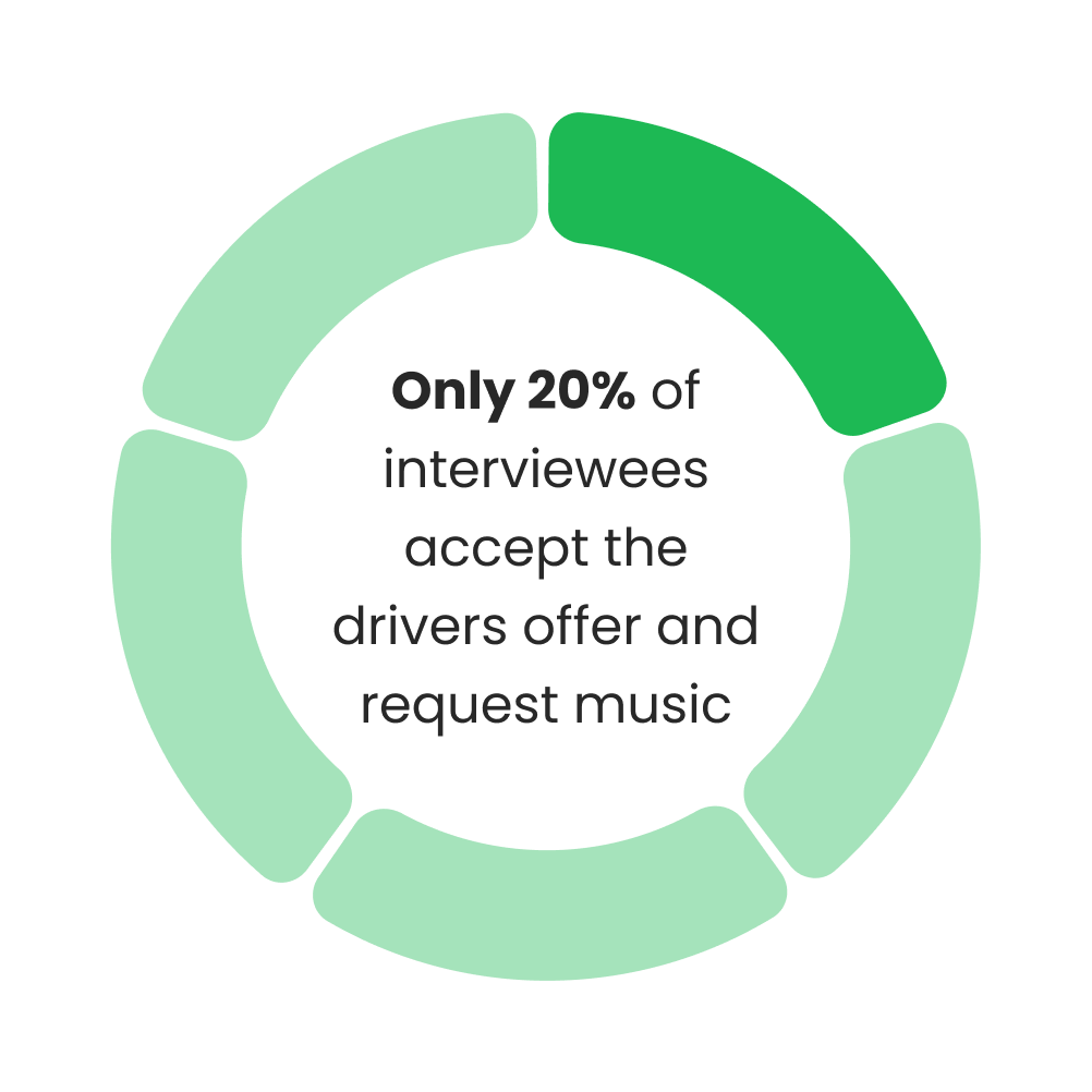 I conducted five 1-on-1 interviews with people between the ages of 20 and 30. All interviewees were pre-screened to ensure that they have used a ride-sharing service in the past as well as being individuals who enjoy music.