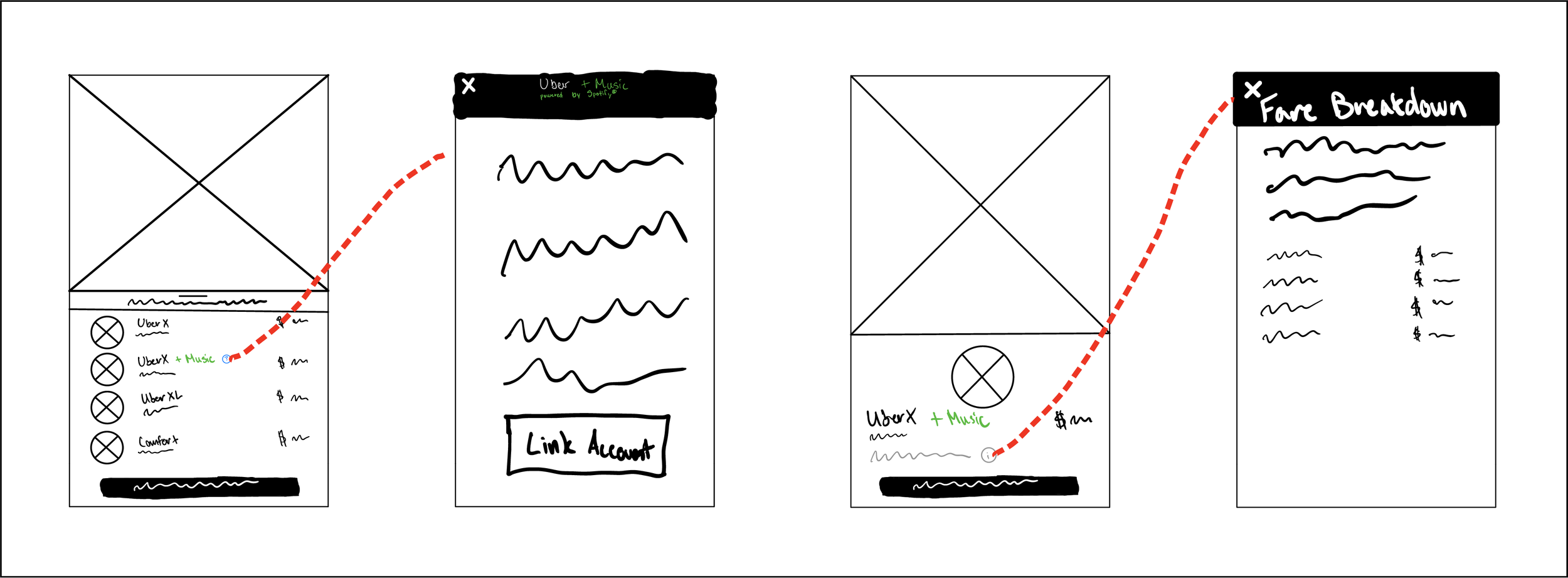 I wanted to make sure that the prototype I produced was fluid and familiar with both Uber and Spotify’s current user interfaces. I wanted the prototype to feel natural for users during my testing. The way I achieved this was by following the respective apps’ current interactions.