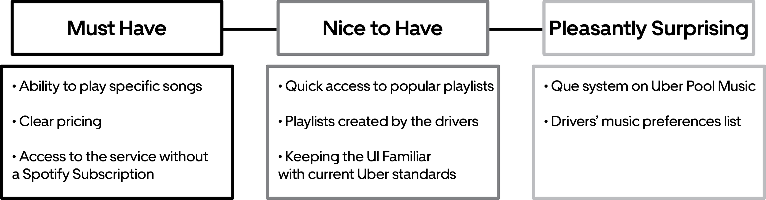 Utilizing my research findings as well as the user interviews, I developed a feature roadmap for the Uber +Music Integration.